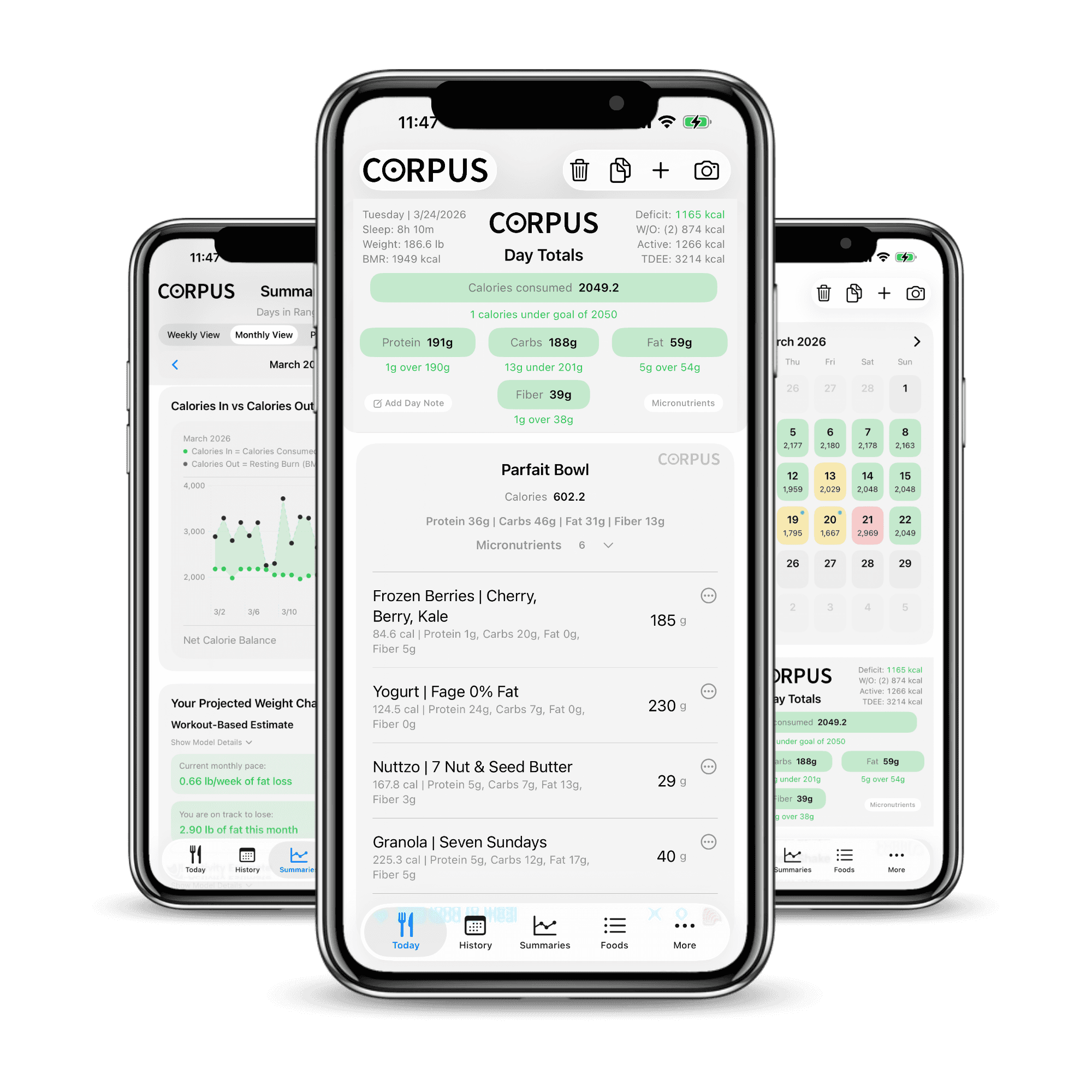 Most trackers help you log food. CORPUS helps you understand the result by bringing intake, output, adherence, and body-composition signals into one system.